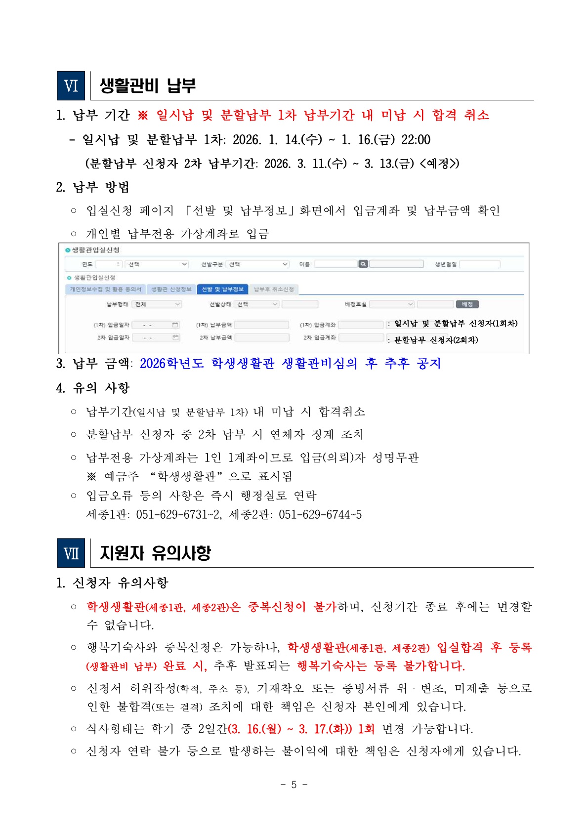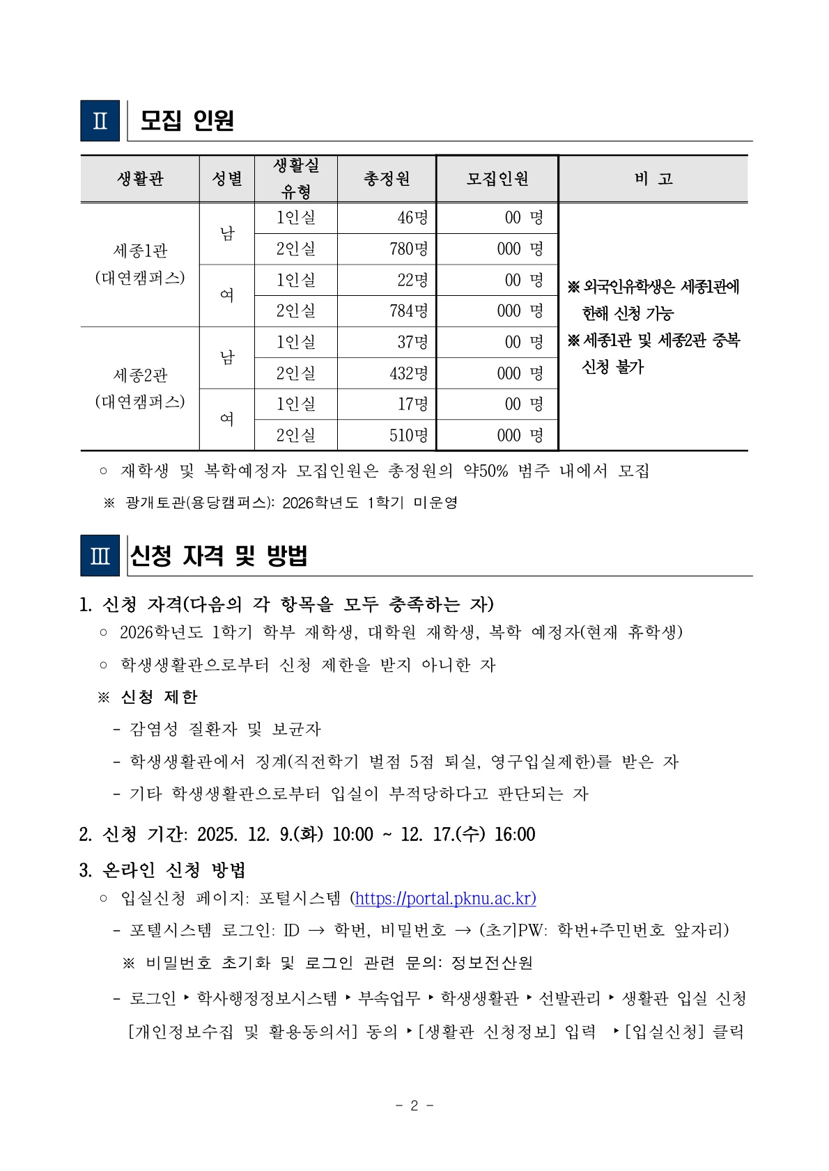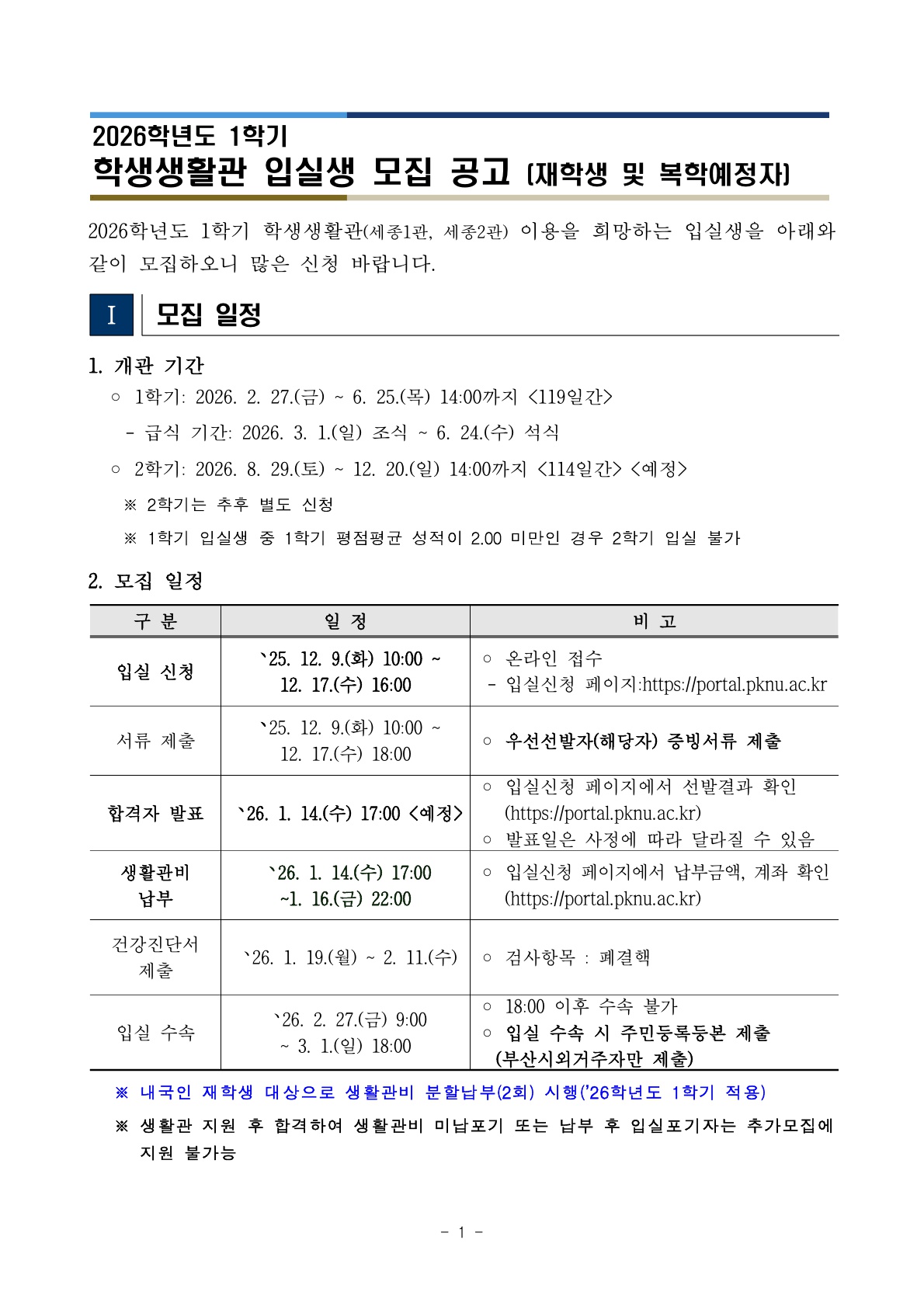 2026학년도 1학기 학생생활관 입실생(재학생 및 복학예정자) 모집 안내