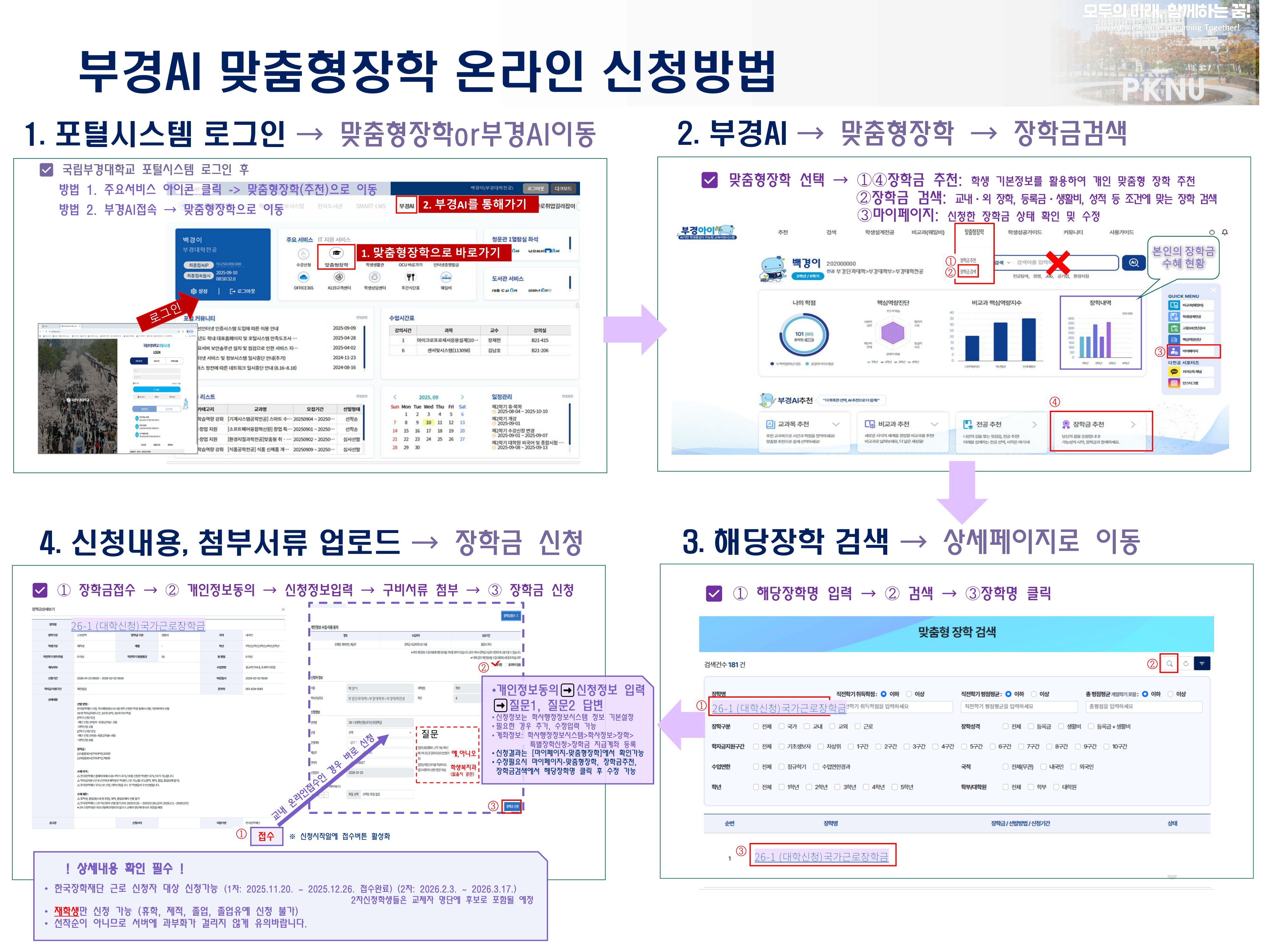 2026학년도 1학기 국가근로장학금 대학신청 기간 및 변경된 신청방법을 안내하오니, 신청을 희망하는 학생들은 아래 내용을 참고하여 기한 내 신청하시기 바랍니다. 1. 신청대상: 한국장학재단 국가근로장학생 1차 신청자 중 학기 근로 희망(가능)자 2. 대학신청기간: 2026. 1. 23.(금) ~ 2. 2.(월), 11일간 3. 신청방법: 포털시스템-부경AI-맞춤형 장학-(대학신청)국가근로장학금 ([붙임]매뉴얼 참조) ※ 기존 이루미 시스템을 통한 신청이 아닌 부경AI 맞춤형 장학 신청으로 변경되었으므로 반드시 확인 요망 - 대학신청 미이행 시 후순위(후보자) 배정 4. 근무기간: 2026. 3. 1. ~ 8. 31.(6개월) 5. 시급: 교내 10,320원, 교외 12,790원 6. 향후일정 - 선발 심사 및 근로지 배정(예정): ~ 2026. 2. 25.(수) - 선발결과 공지(예정): 2026. 2. 27.(금) 8. 기타사항 - (한국장학재단) 국가근로장학생 2차 신청기간: 2026. 2. 3. ~ 3. 17 ※ 2차 신청자의 경우 별도의 대학신청 없이 학기 중 국가근로장학 후보자로 배정 예정