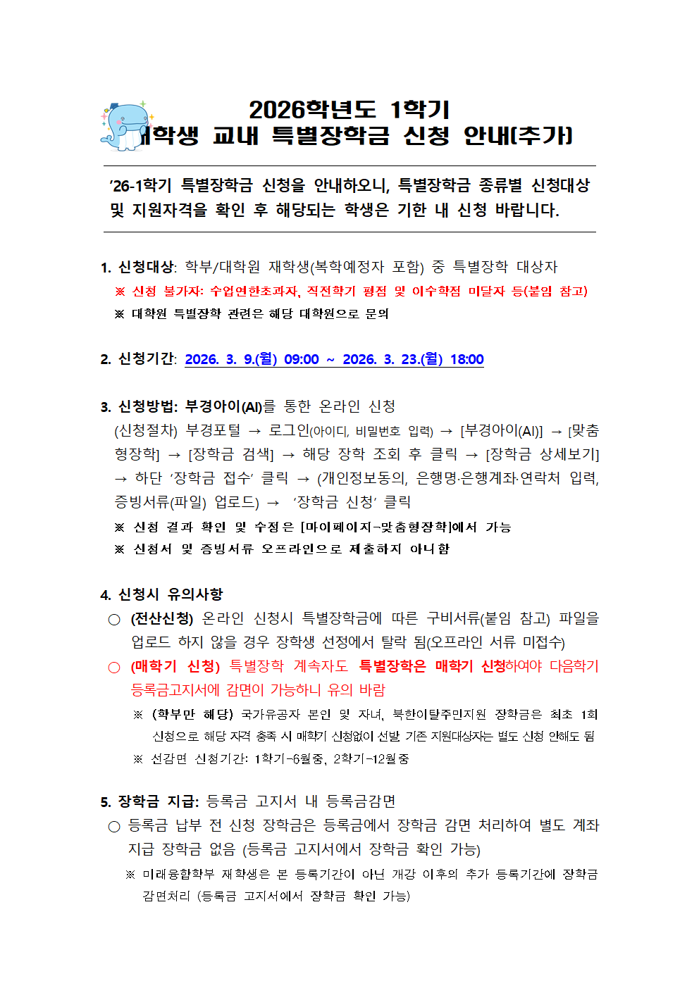 ’26-1학기 교내 저소득층 및 특별장학생 추가 선발 안내
