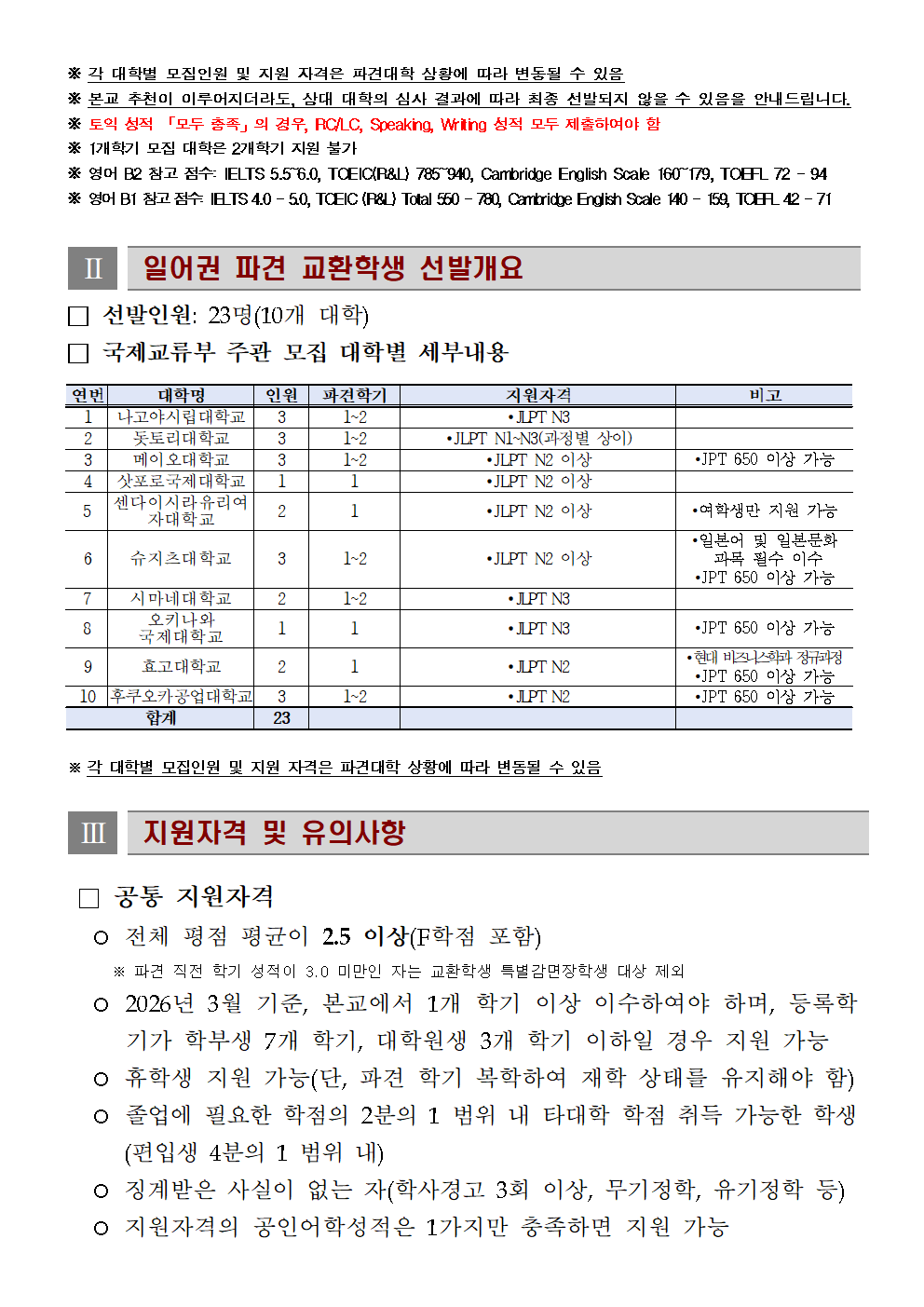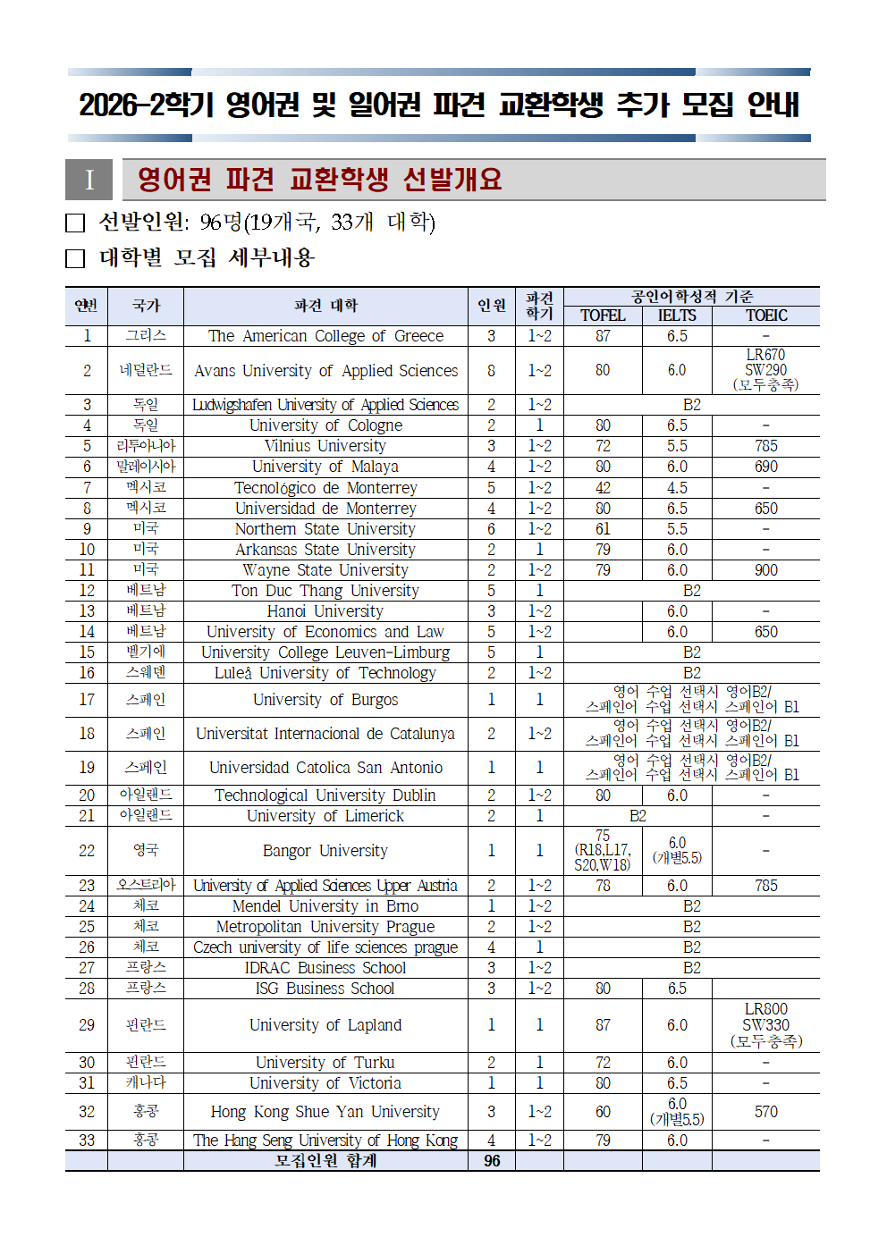 2026학년도 2학기 영어권 및 일본권 파견 교환학생 추가모집 안내