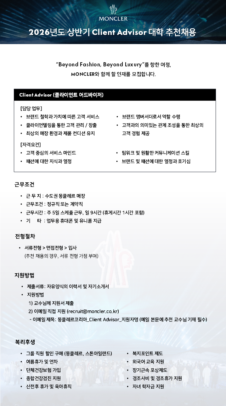[채용공고] 몽클레르코리아 Client Advisor 신입 인재 채용