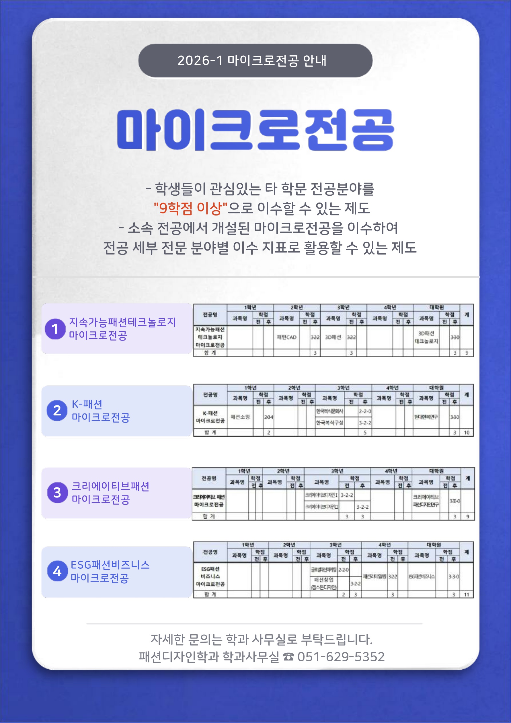 1. 부산협업패션테크크리에이터융합전공 신청 희망자 → 복수전공 신청 기간(1/12 ~ 1/14) 내 복수전공 신청 안내문을 참고하여 신청 2. 마이크로 전공 신청 희망자 → 마이크로전공 신청 기간(1/12~1/23) 내 마이크로전공 신청 안내문을 참고하여 신청 1) K-패션 마이크로전공 - (1학년)패션소잉 →(3학년)한국복식구성, 한국복식문화사 →(대학원)현대한복연구 2) 크리에이티브패션 마이크로전공 - (3학년)크리에이티브디자인Ⅰ, 크리에이티브디자인Ⅱ →(대학원)크리에이티브패션디자인연구 3) 지속가능패션테크놀로지 마이크로전공 - (2학년)패턴CAD →(3학년)3D패션 → (대학원)3D패션테크놀로지 4) ESG패션비즈니스 마이크로전공 - (3학년)글로벌패션마케팅, 패션창업(캡스톤디자인) →(4학년)패션리테일링→ (대학원)ESG패션비즈니스 3. 문의) 051-629-5352, 패션디자인학과 학과사무실