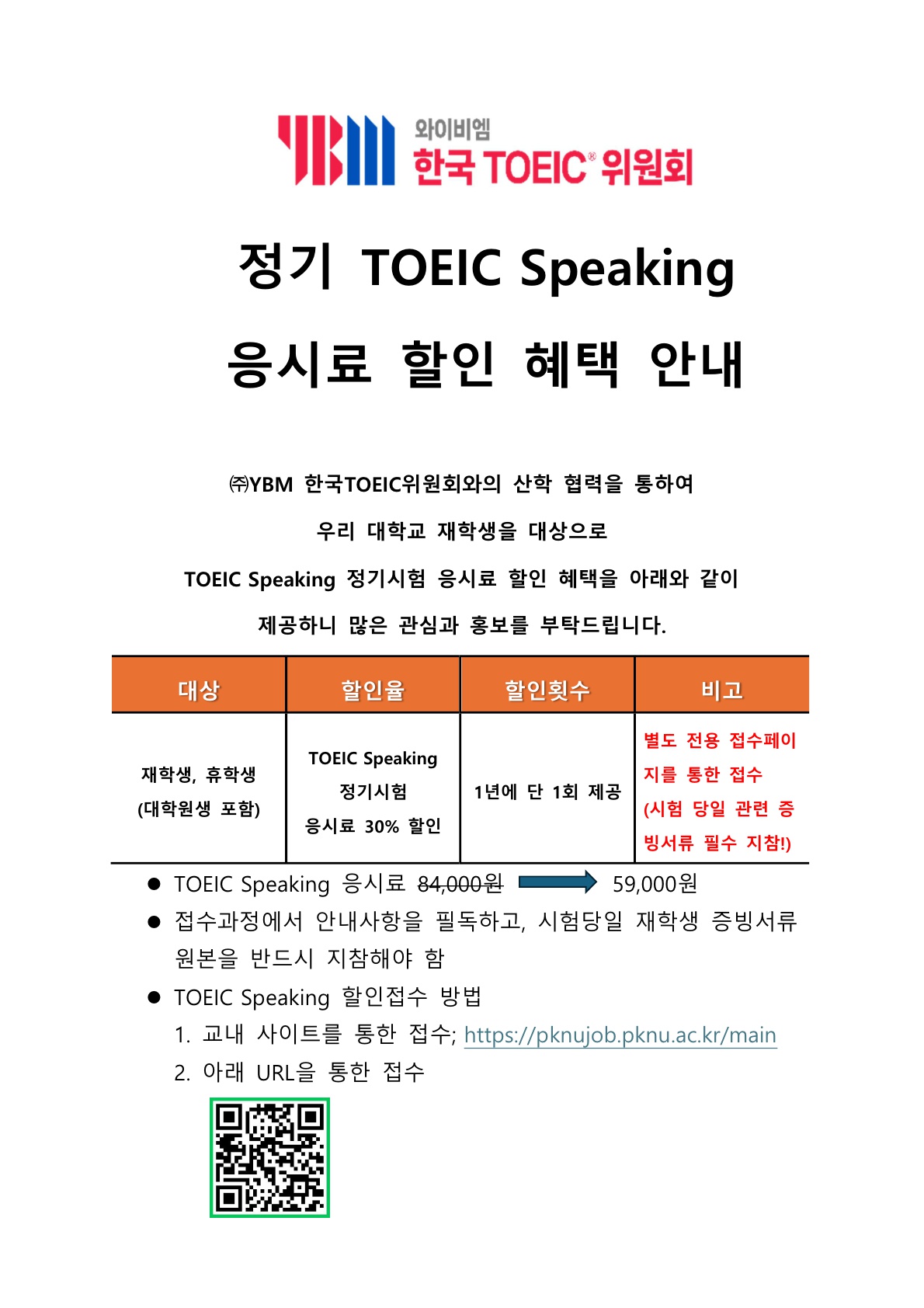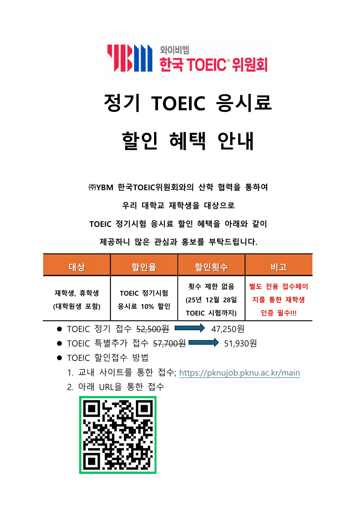 국립부경대학교 재학생(대학원생 포함) TOEIC 및 Toeic Speaking, JPT 정기시험 특별 할인 연장 안내