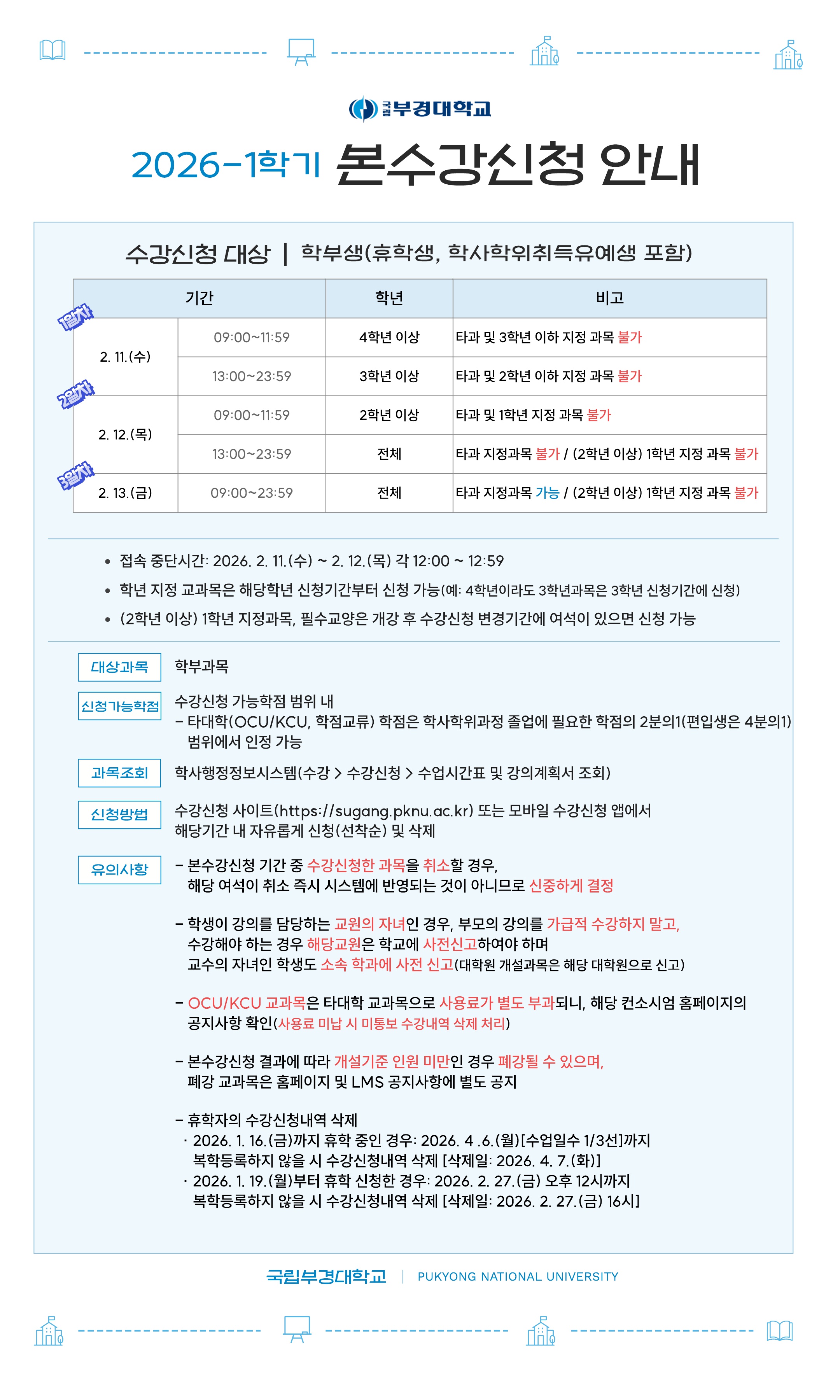 2026학년도 신입생 수강신청 필요 교과목 및 각종 설명자료 안내