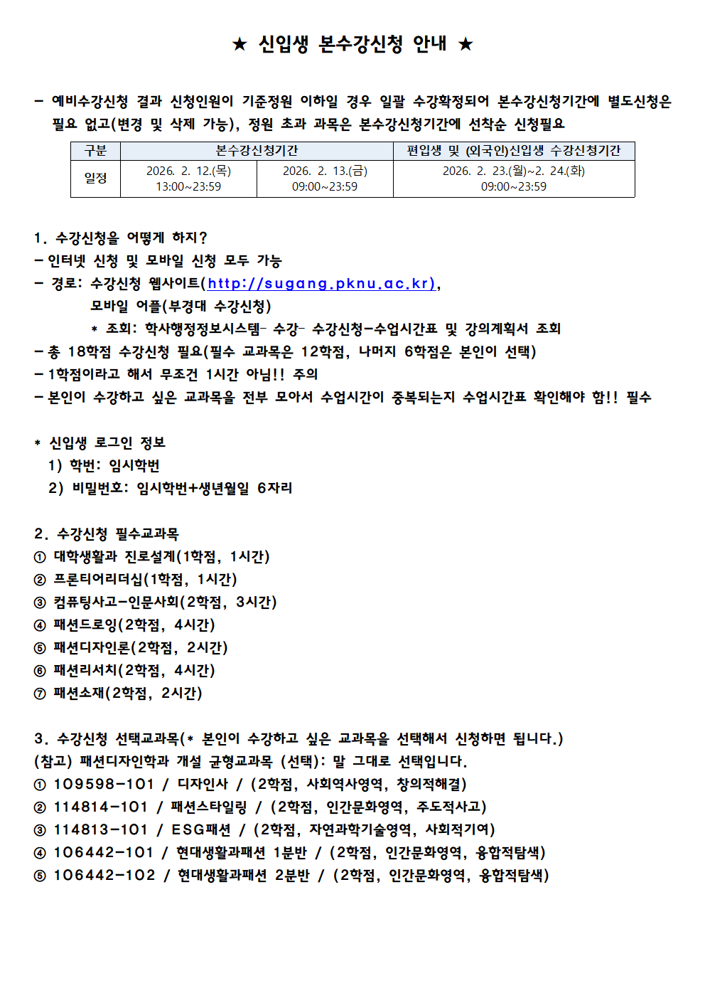 2026학년도 신입생 수강신청 필요 교과목 및 각종 설명자료 안내