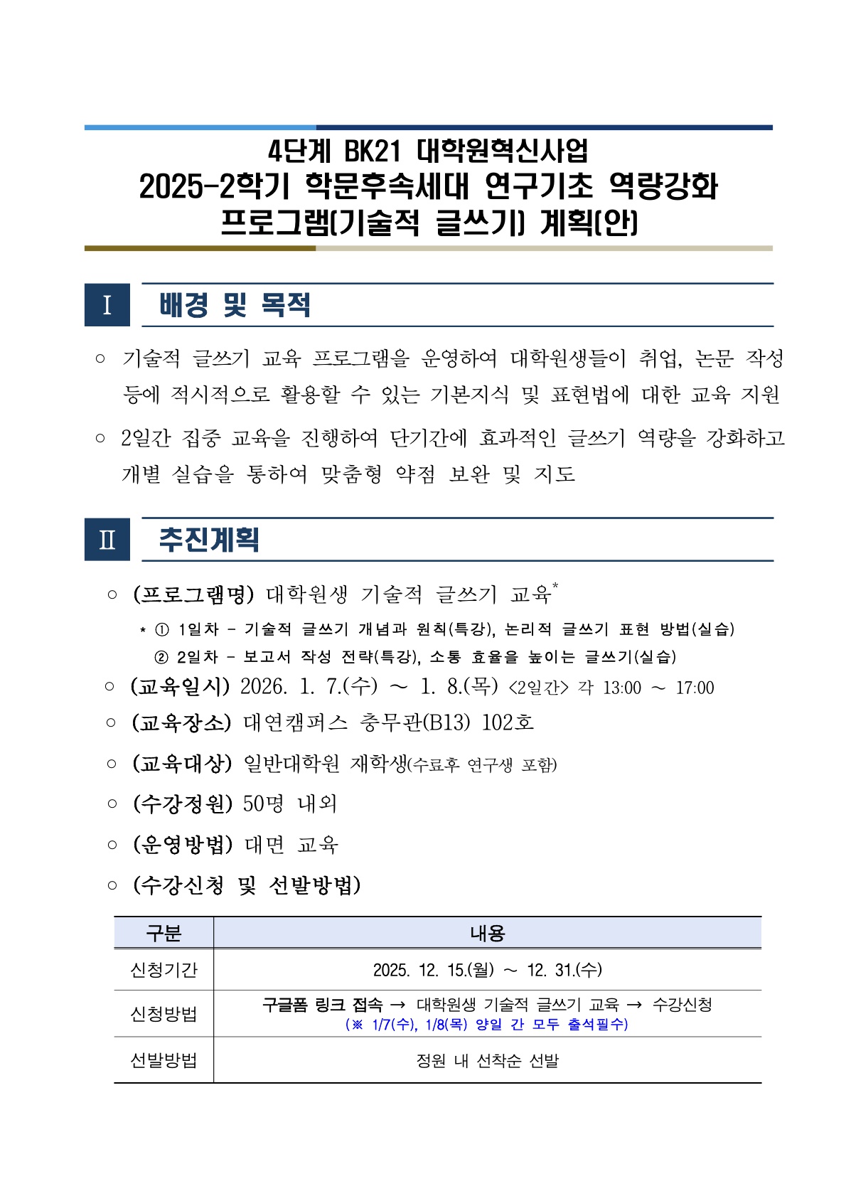 2025-2학기 학문후속세대 연구기초 역량강화(기술적 글쓰기) 프로그램 신청 안내
