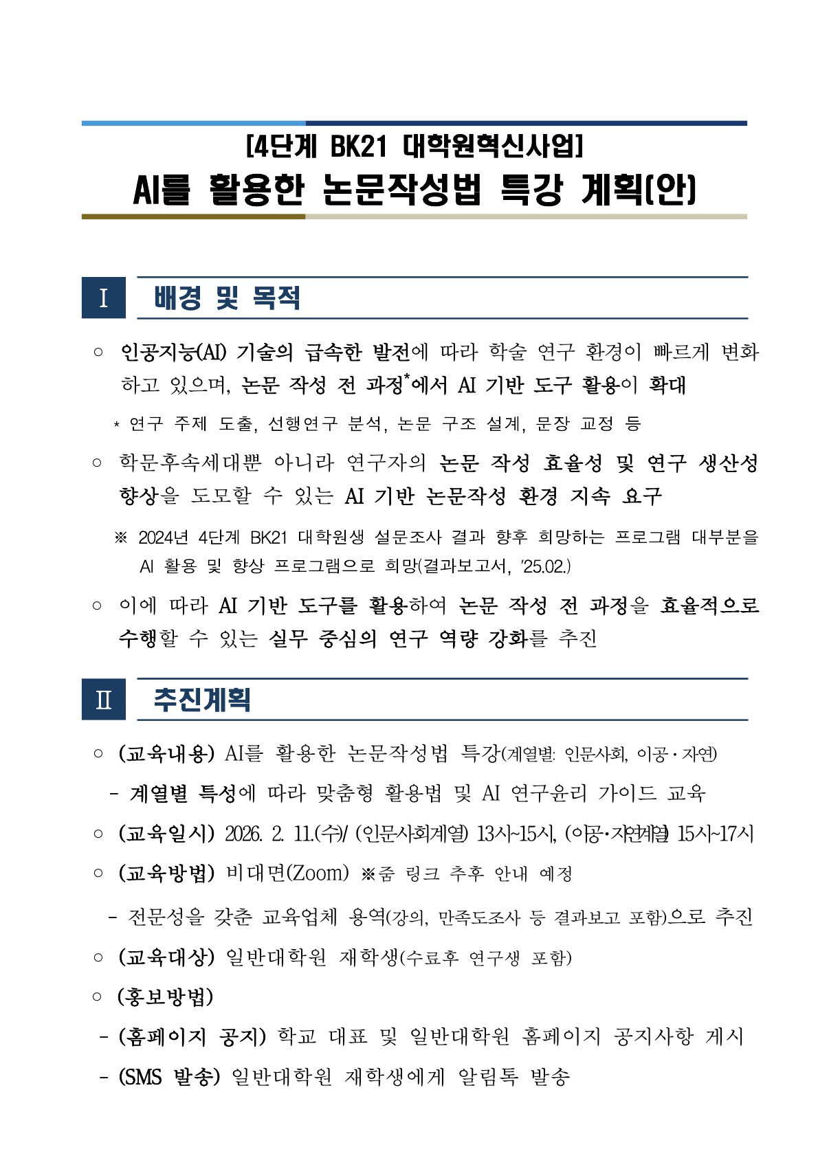 [4단계 BK21대학원혁신사업]「AI를 활용한 논문작성법 특강」 안내